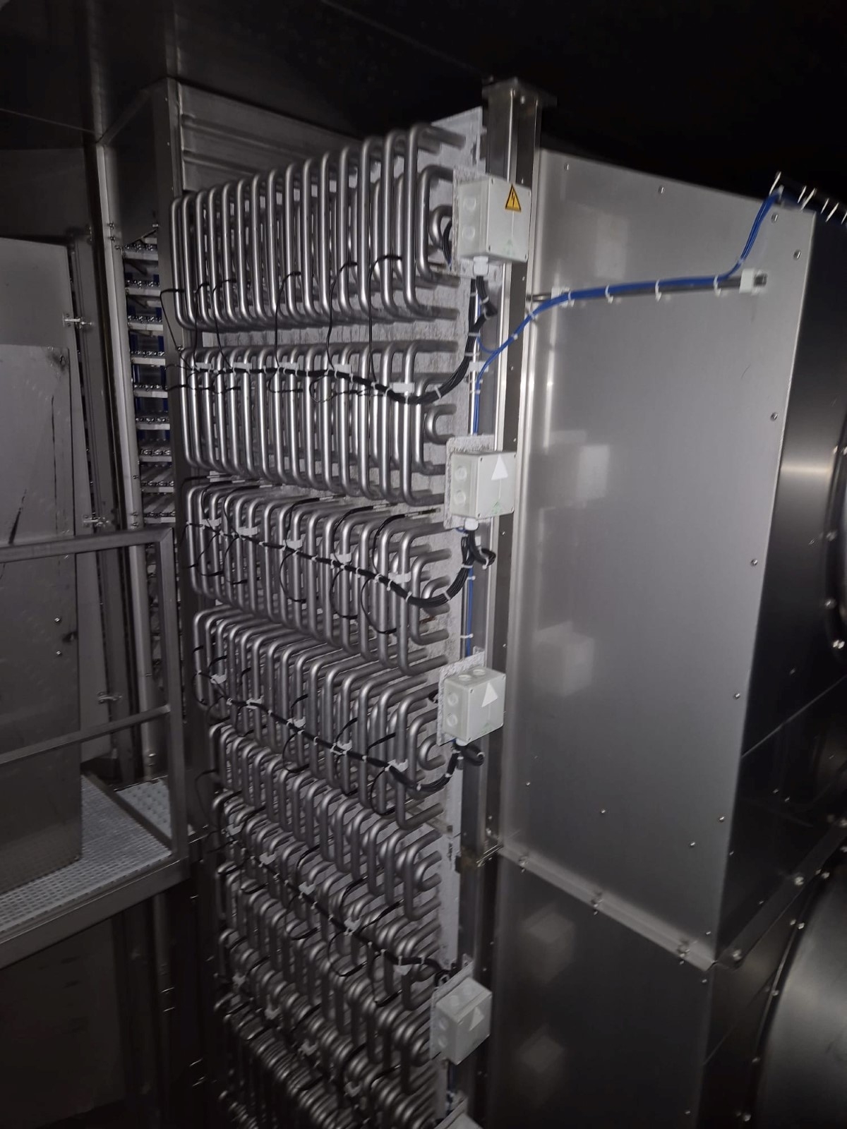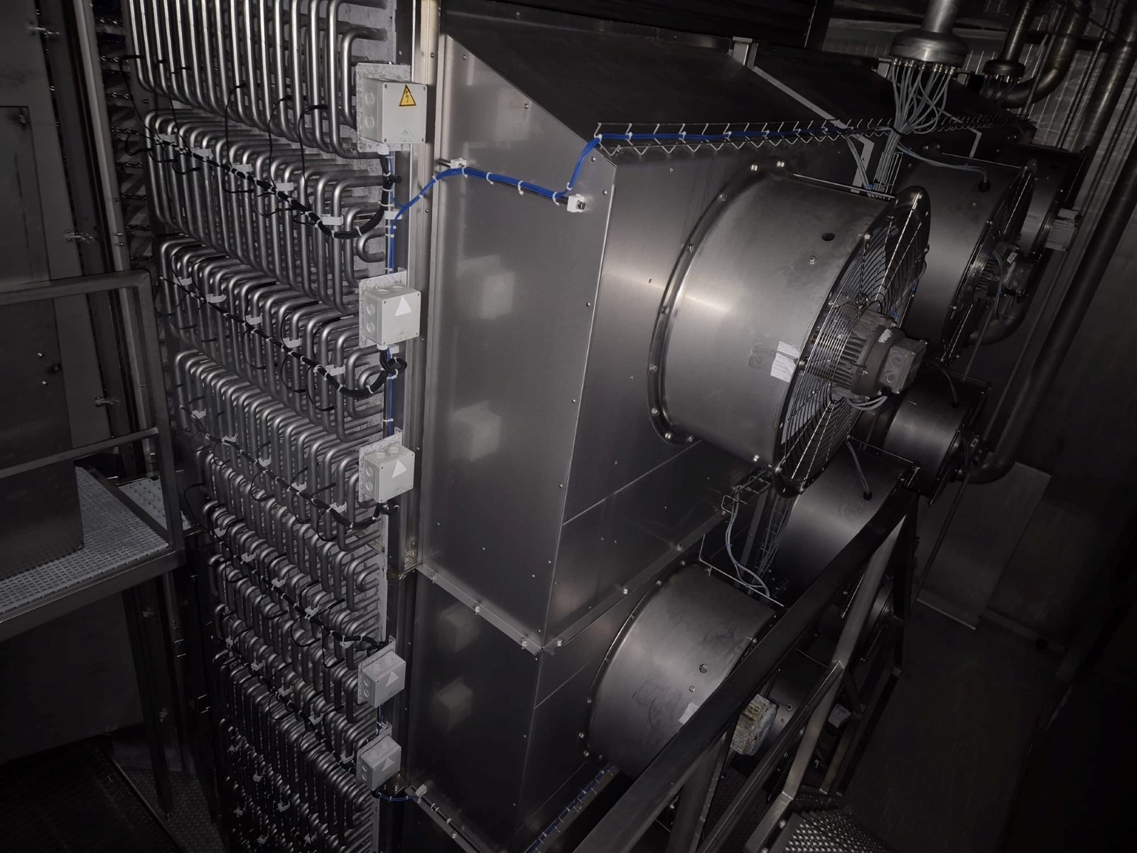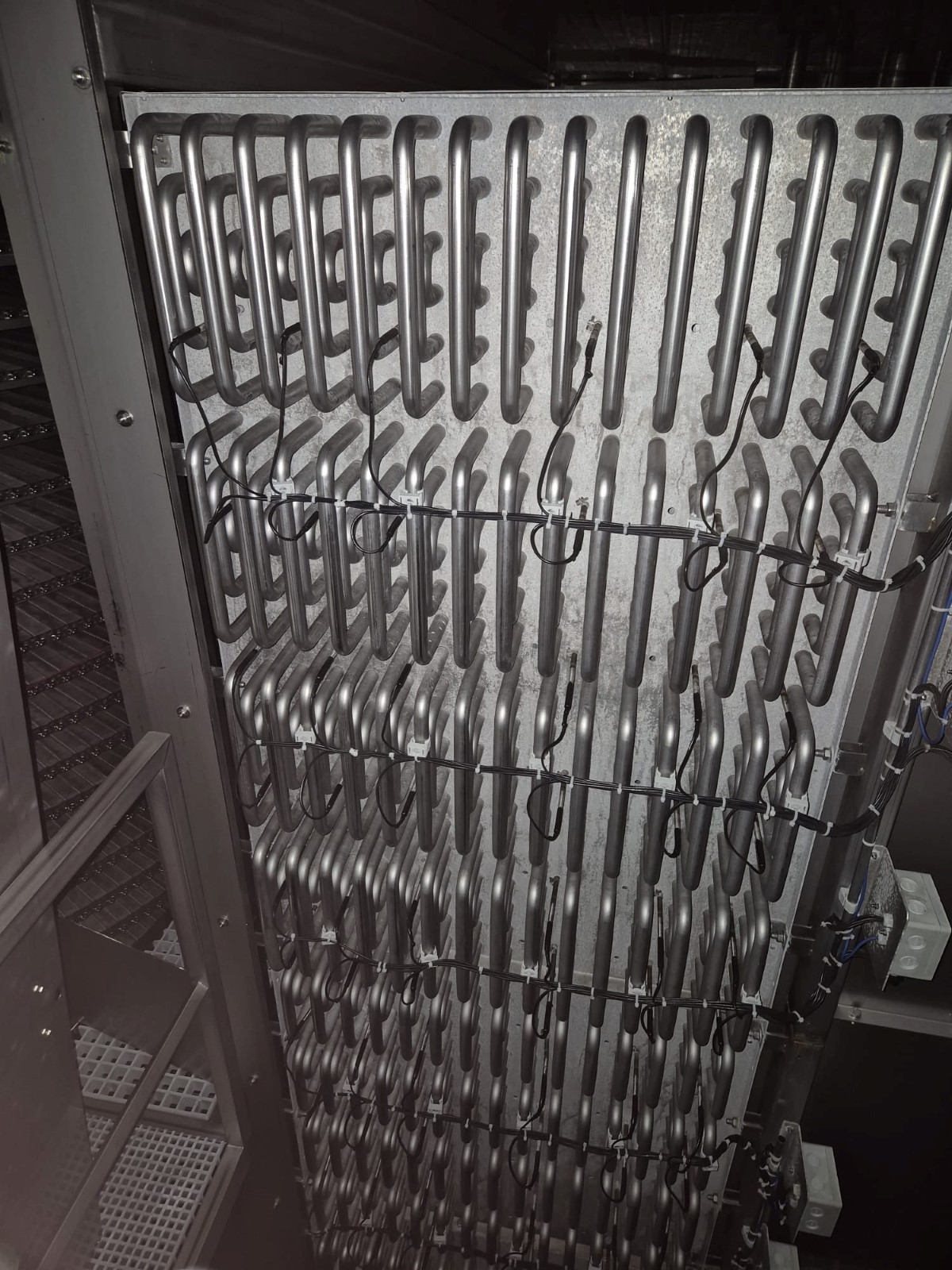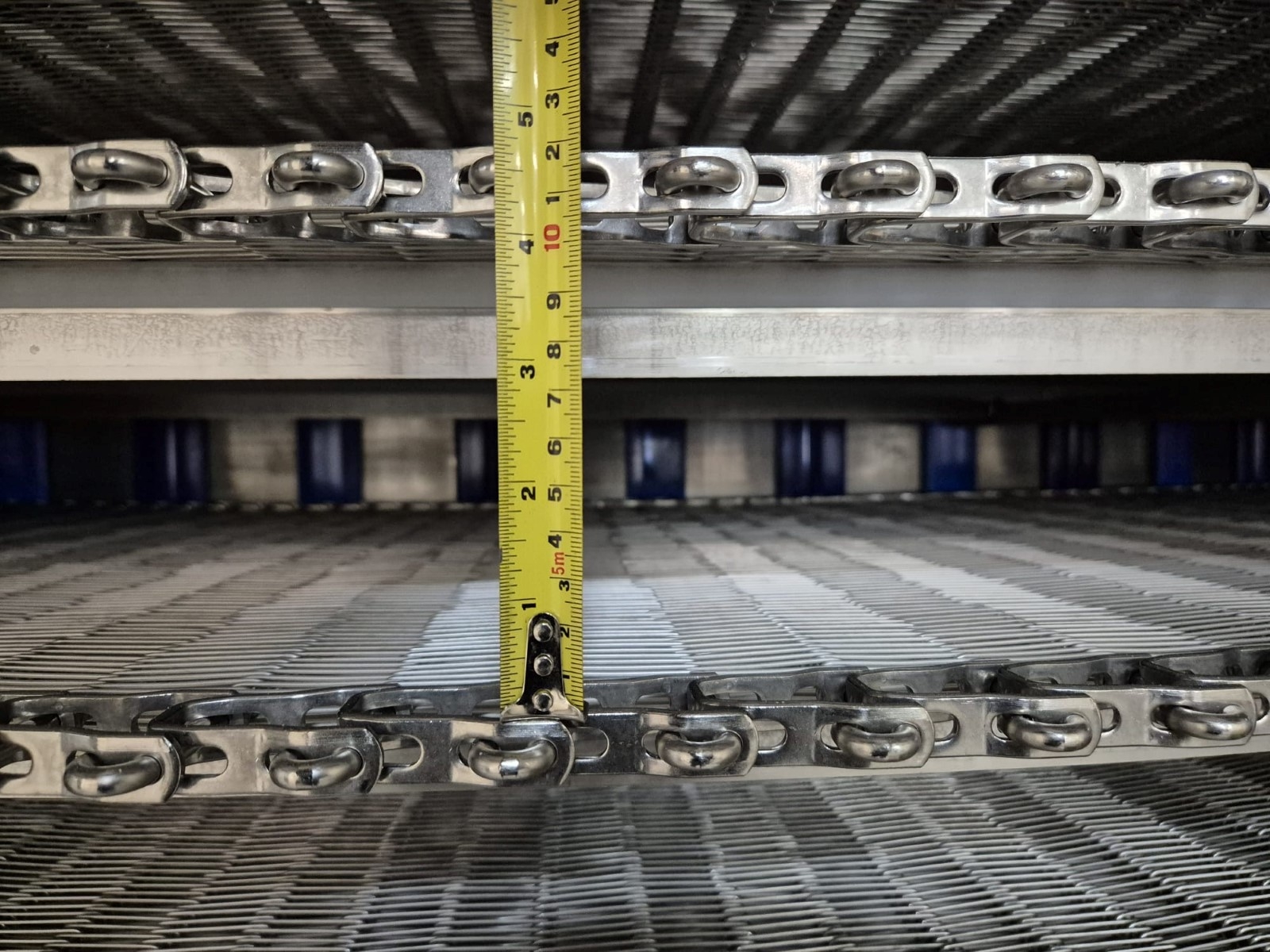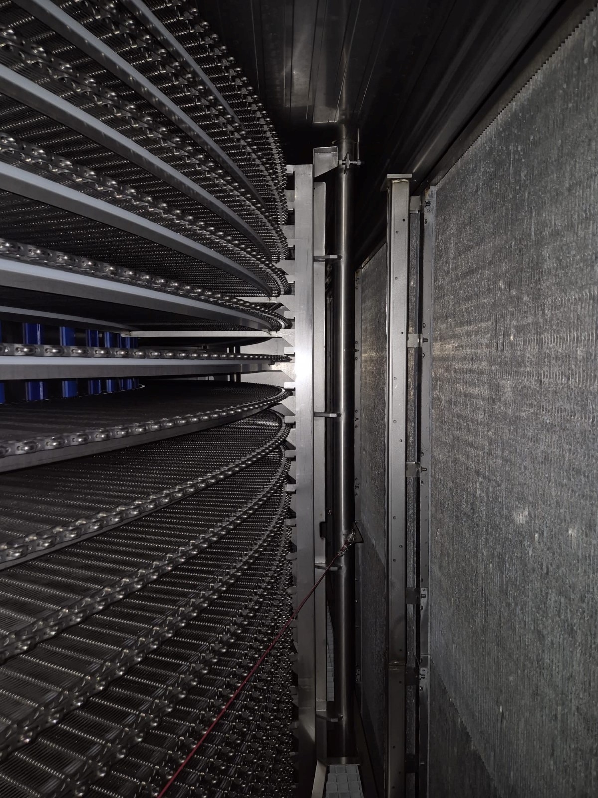 Fine mesh stainless steel belt, Electrical heating elements thorugh coils for defrosting, (Optional) original pumped Ammonia Bitzer cooling compressor skid